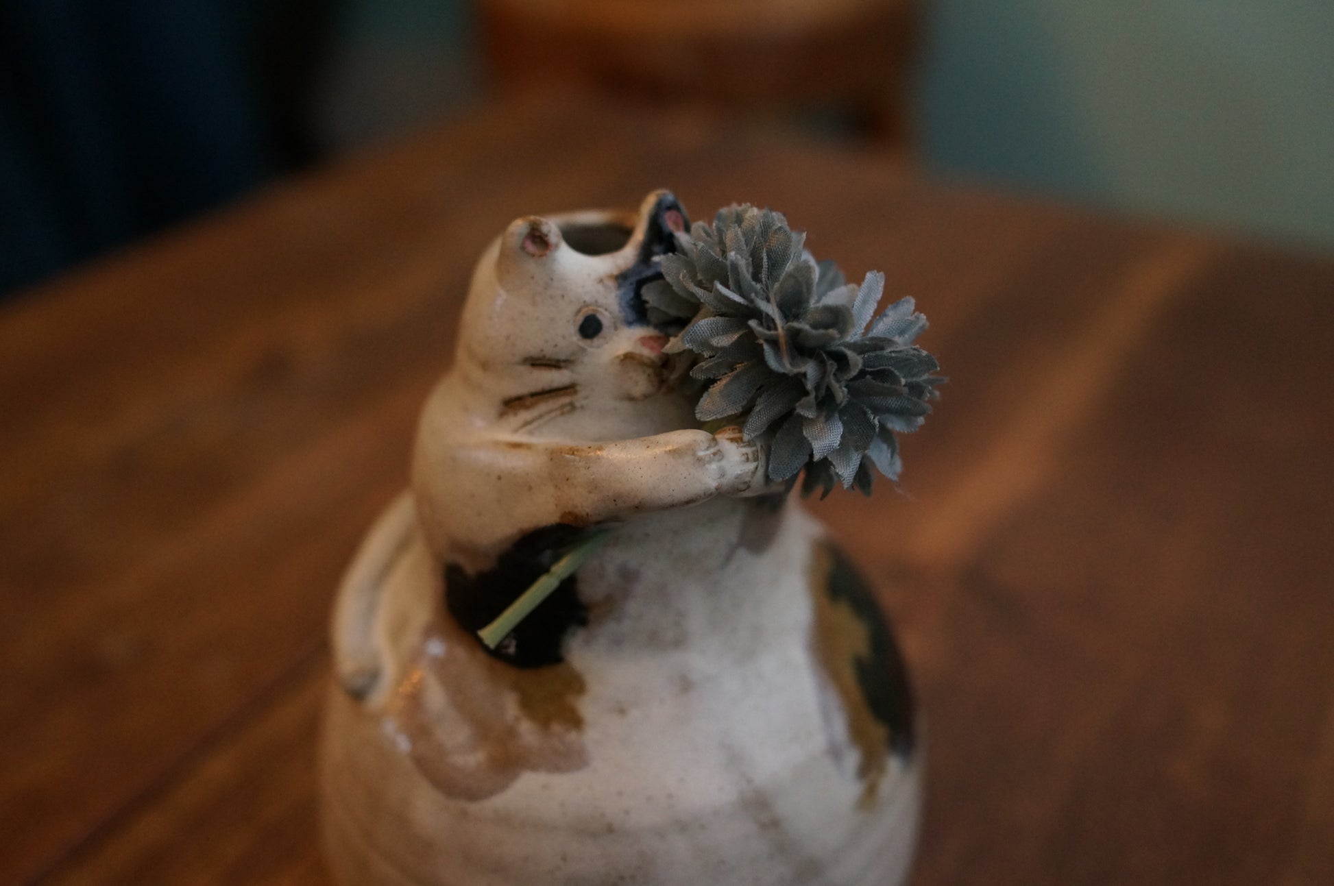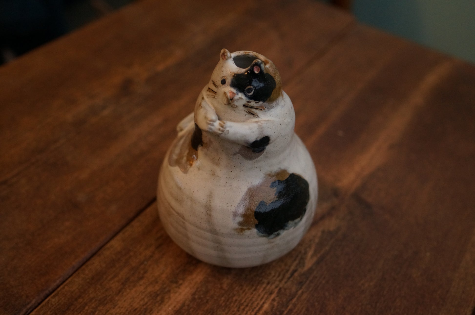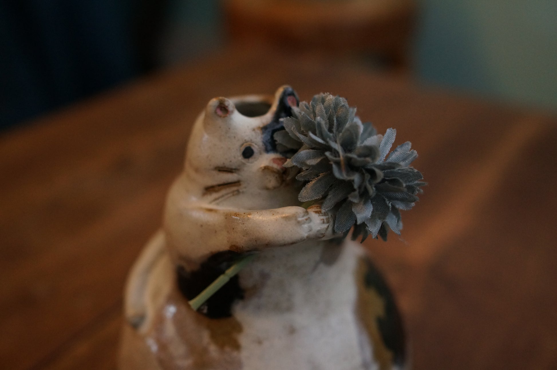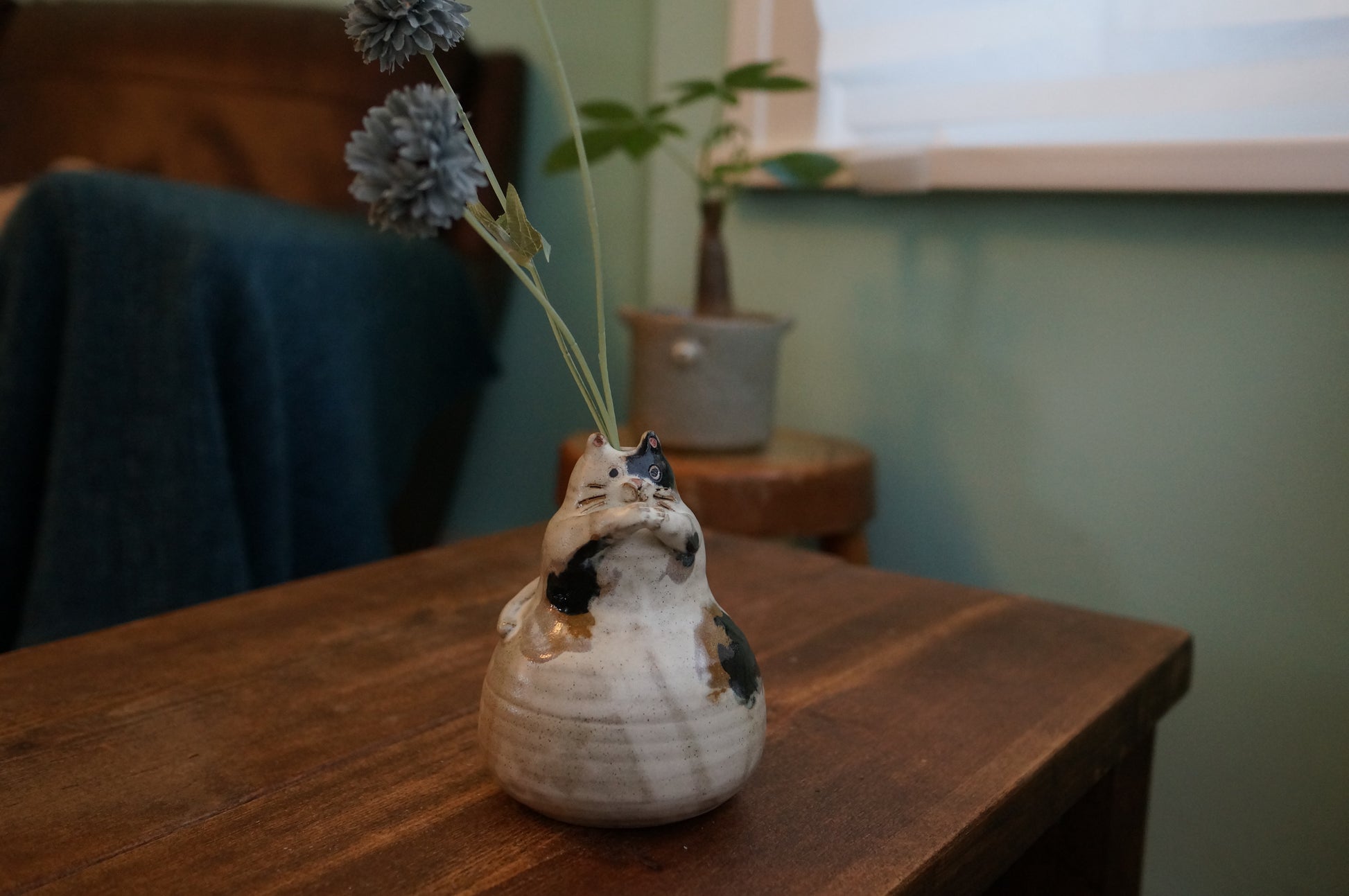 This ceramic black cat vase was handmade using stoneware. It is glazed both inside and outside.