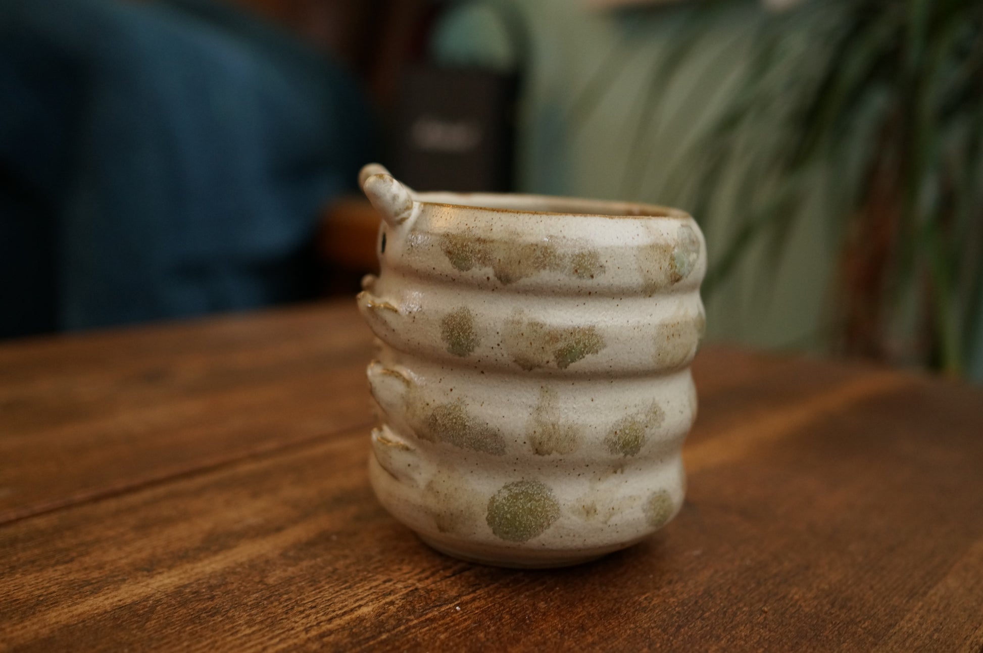 This ceramic caterpillar cup was handmade using stoneware. It is glazed both inside and outside. It is a perfect size for enjoying your afternoon tea.